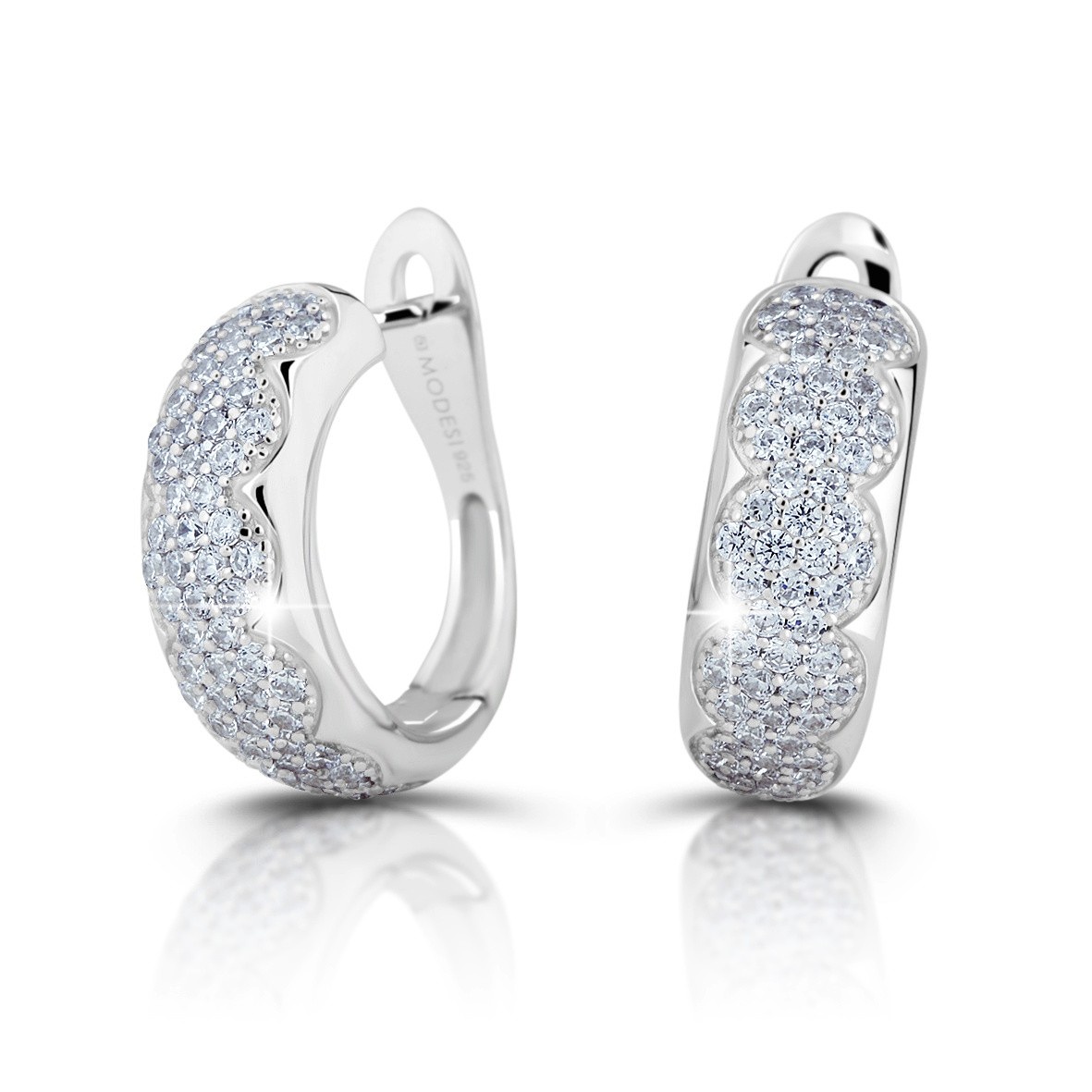 Jemné stříbrné náušnice MODESI M01621. Model je vhodný jako dárek v významným oslavám, je možné dokoupit prsten a náhrdelník. Náušnice jsou osazeny zirkony s vysokým leskem. Průměr náušnice je 18 mm, šířka 7 mm. Celková váha páru je 6 g, ryzost stříbra 625. Náušnice jsou značeny státním puncem a logem MODESI.